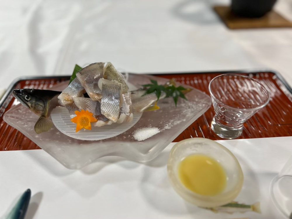(こちらが鮎の刺身です。毎年食べてもそのおいしさに感動します。)