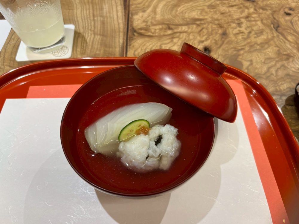 新玉ねぎと鱧のお吸い物で、新玉ねぎが信じられないくらい甘かったのですが、鱧のシンプルな味と合わさって、これまた非常に美味しかったです!