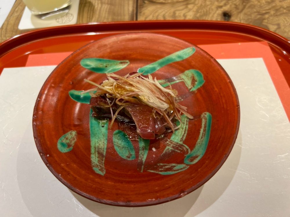 初ガツオの刺身で、上に茗荷と特製ポン酢で味付けされていたのですが、何切れも欲しくなるぐらいカツオのしっかりかつ濃厚な赤身に、さっぱりとする茗荷がマッチして最高でした!