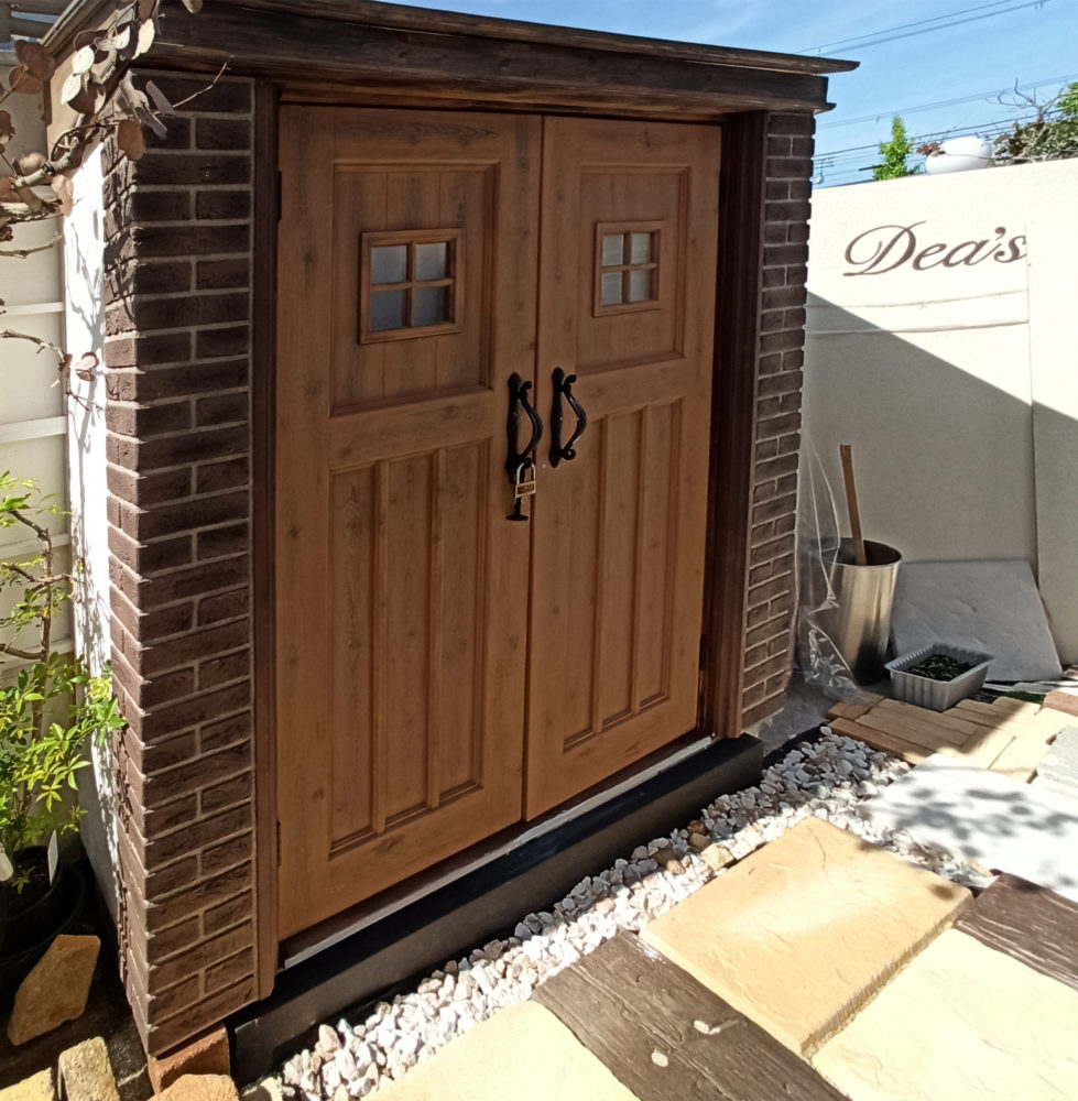 カンナブラウンのレンガ柱とカンナオレンジの扉は、商品に出来ない余り物を使わせていただきました。雨水の流れはカンナ同様で、軒は横樋、レンガ柱は縦樋の役目を果たしてくれるよう設計しています。